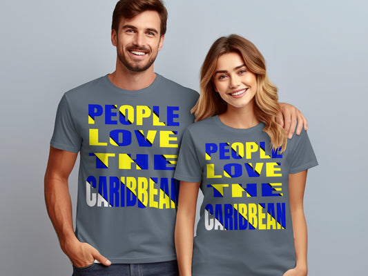 Bright Caribbean Love Graphic Tee, Yellow Blue Statement T-Shirt, Bold Typography Travel Shirt